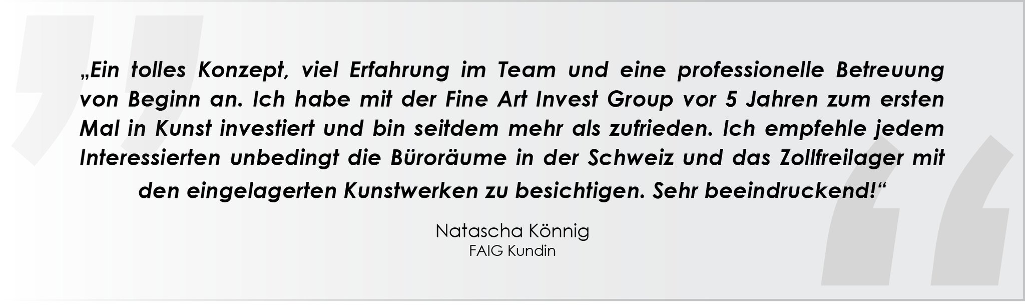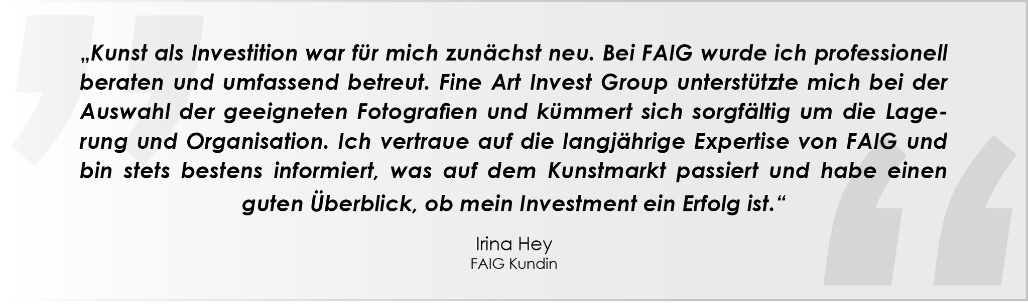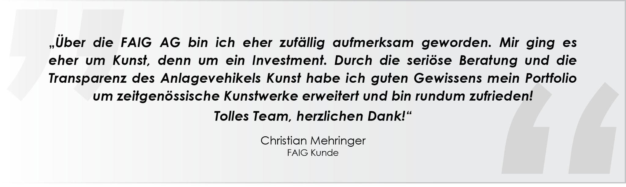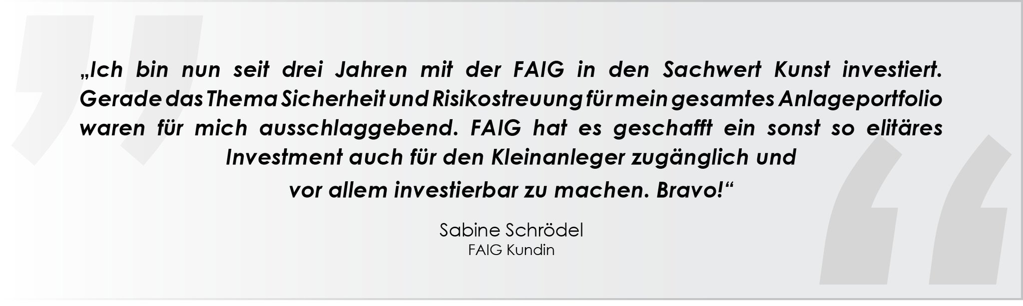 Die FAIG ist ein Kunsthändler und Kunstberater mit der Erfahrung aus drei Generationen. Sie ermöglicht Privatpersonen durch ein internationales Netzwerk von Kunstexperten erstmals den professionellen Einstieg in den Kunstmarkt. Dabei bietet die FAIG einen Rundum-Service von der Beratung, über den Kauf, bis hin zur Versicherung und Einlagerung der Kunstwerke in einem staatlich gesicherten Zollfreilager.